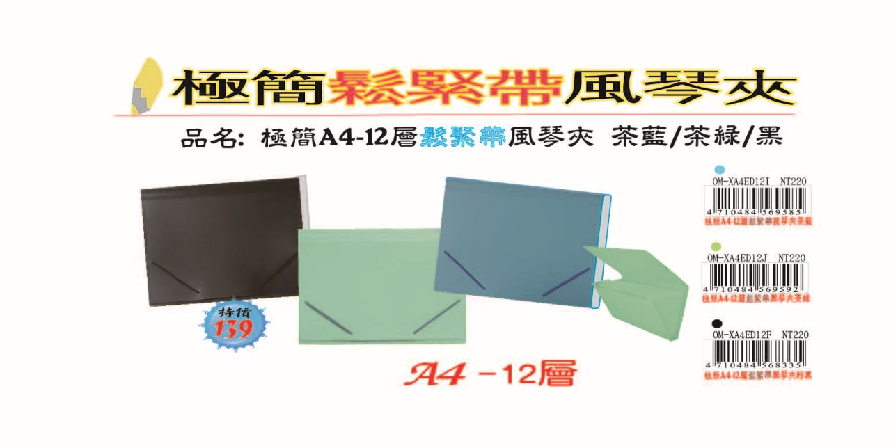 【檔案家】極簡A4鬆緊帶12層風琴夾 黑/茶藍/茶綠 OM-XA4ED12